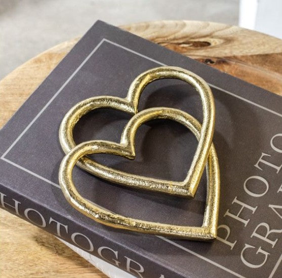 A sweet symbol of love, this sculptural accent features two interlocking hearts in a warm gold finish—perfect for a shelf, mantel, or bedside table. Its slim profile tucks neatly into vignettes and centerpieces, making it a thoughtful gift for weddings, anniversaries, or Valentine’s Day.
