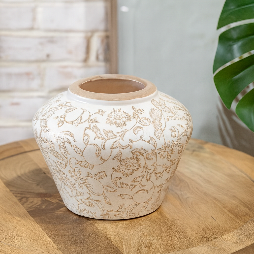 Timeless, warm, and beautifully detailed, the 6.5" Beige Heirloom Vase brings classic charm to any space. Crafted from durable ceramic, this vase features a soft beige finish with delicate etched floral motifs that give it an antique, heirloom-inspired look. Its rounded silhouette and wide opening make it perfect for displaying fresh blooms, dried stems, or standing alone as a decorative statement piece.