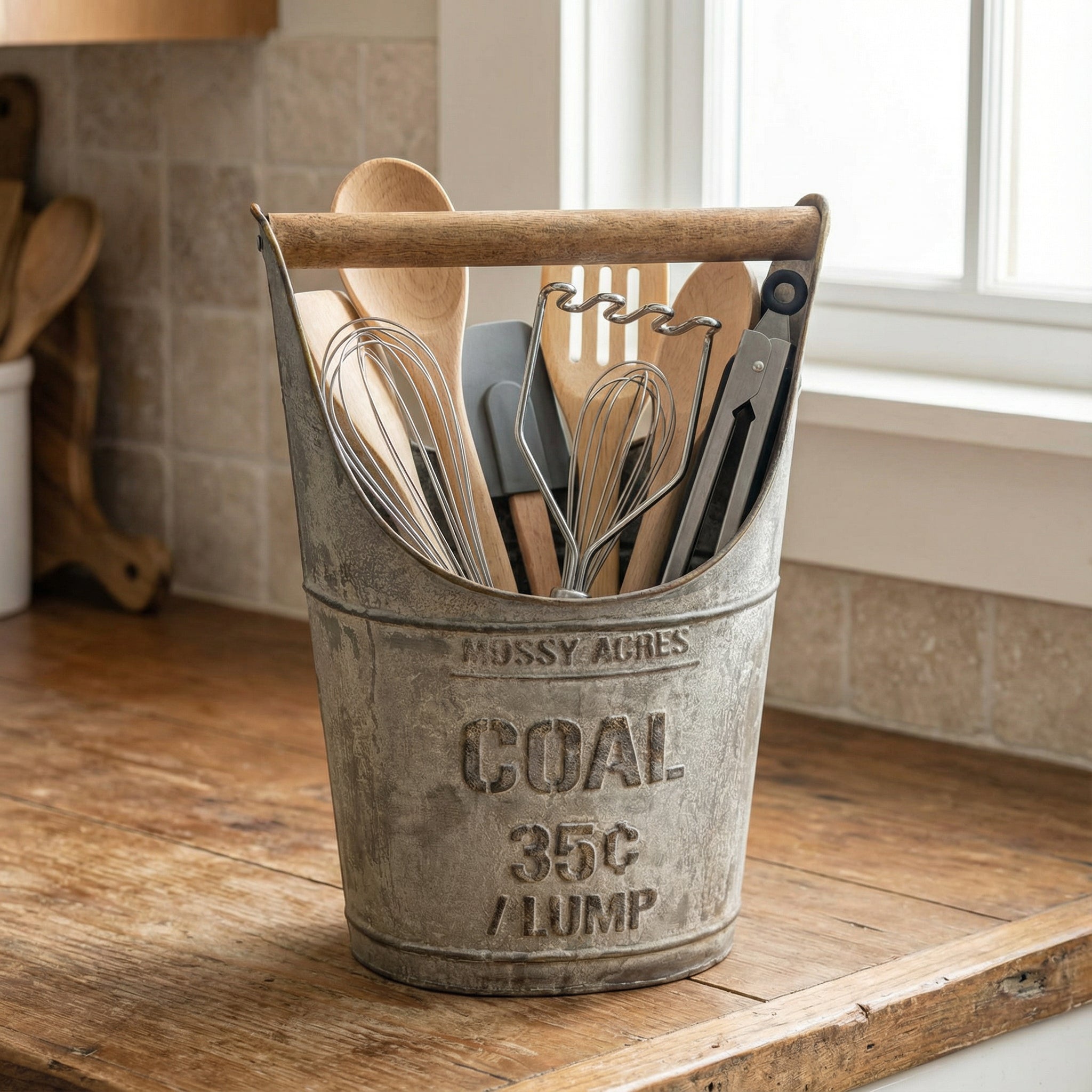 Add rustic charm and practical storage to your home with this Coal Bucket with Wooden Handle. Crafted with a vintage-inspired metal finish and embossed lettering, this piece brings farmhouse character to any space. The sturdy wooden handle offers easy portability while adding warmth and contrast to the aged metal design.