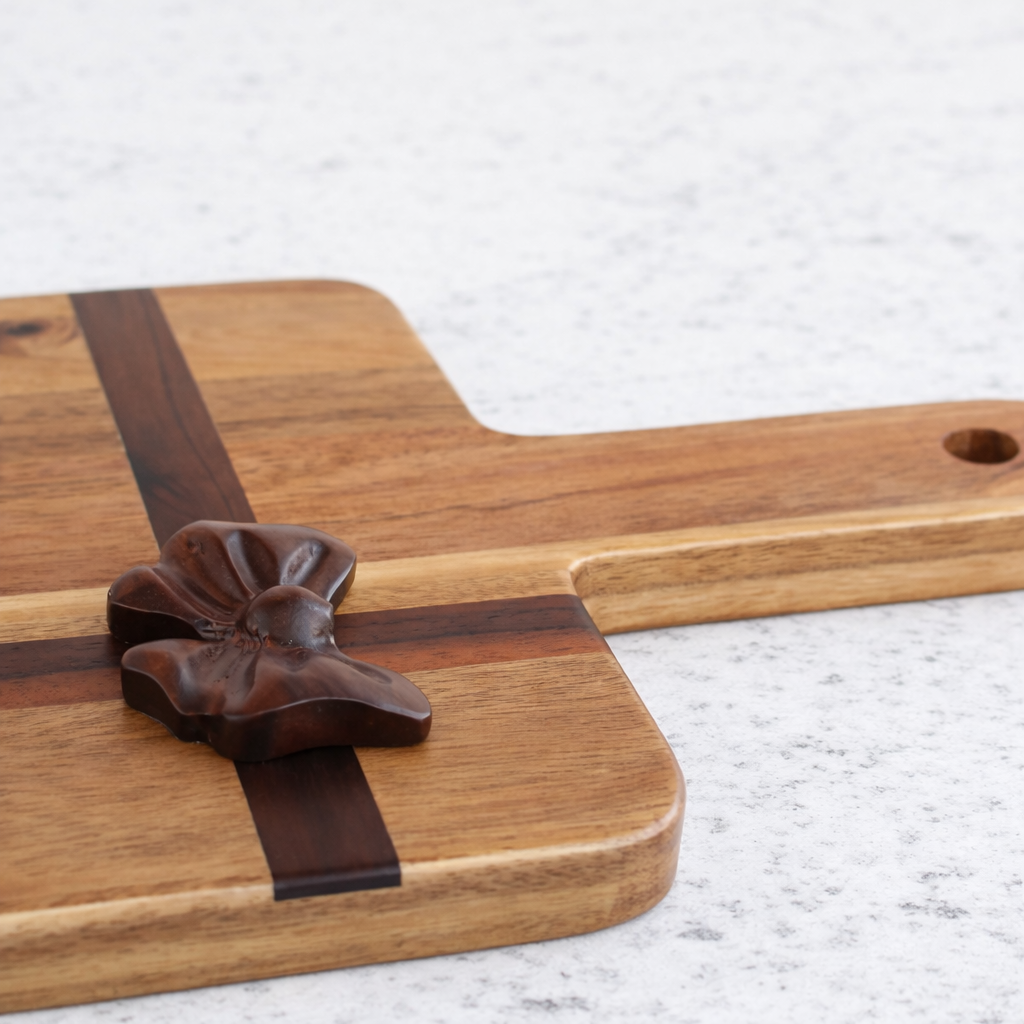 Bring charm and functionality to your kitchen with our 19 x 8 Rectangular Bow Design Serving Board. Crafted from beautiful acacia wood, each board showcases naturally rich grain patterns that make every piece truly unique. The carved bow accent adds a delightful touch, making this board perfect for entertaining, gifting, or elevating everyday meals.