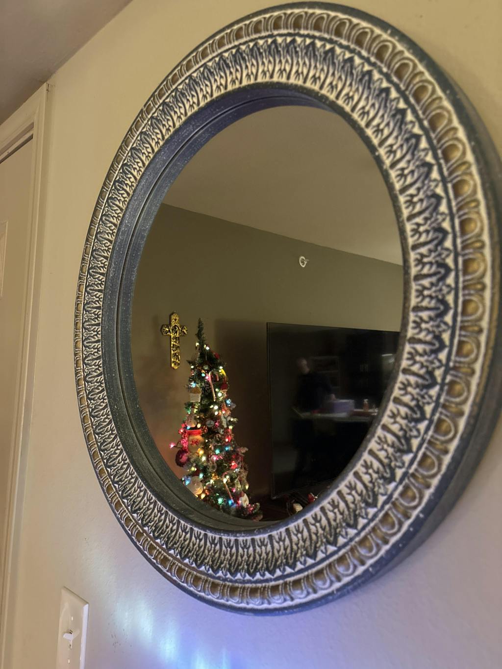 Bring elegance and timeless style to your space with our Round Ornate Mirror, featuring a beautifully detailed blue and gold frame. The intricate design and aged finish create a perfect balance of sophistication and charm, making it a striking statement piece for any room.