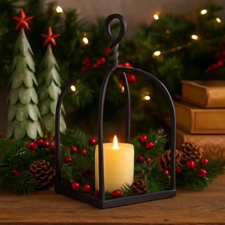 Decorative lantern with a candle, surrounded by festive elements on a wooden surface.