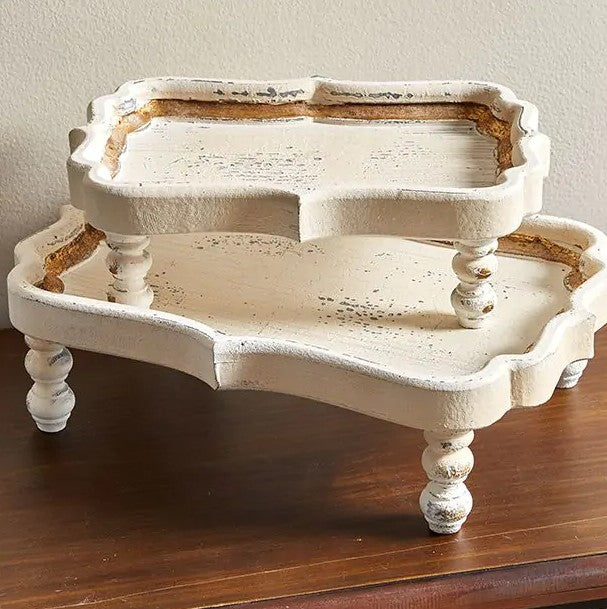 Elevate your displays with our Scalloped Edge Footed Tray, Set of 2. Designed with a charming scalloped edge and footed base, these versatile risers are perfect for showcasing potted plants, plated treats, or a favorite candle collection. Each tray is finished in a distressed cream tone with subtle gold accents, offering a beautiful contrast that complements any décor style.