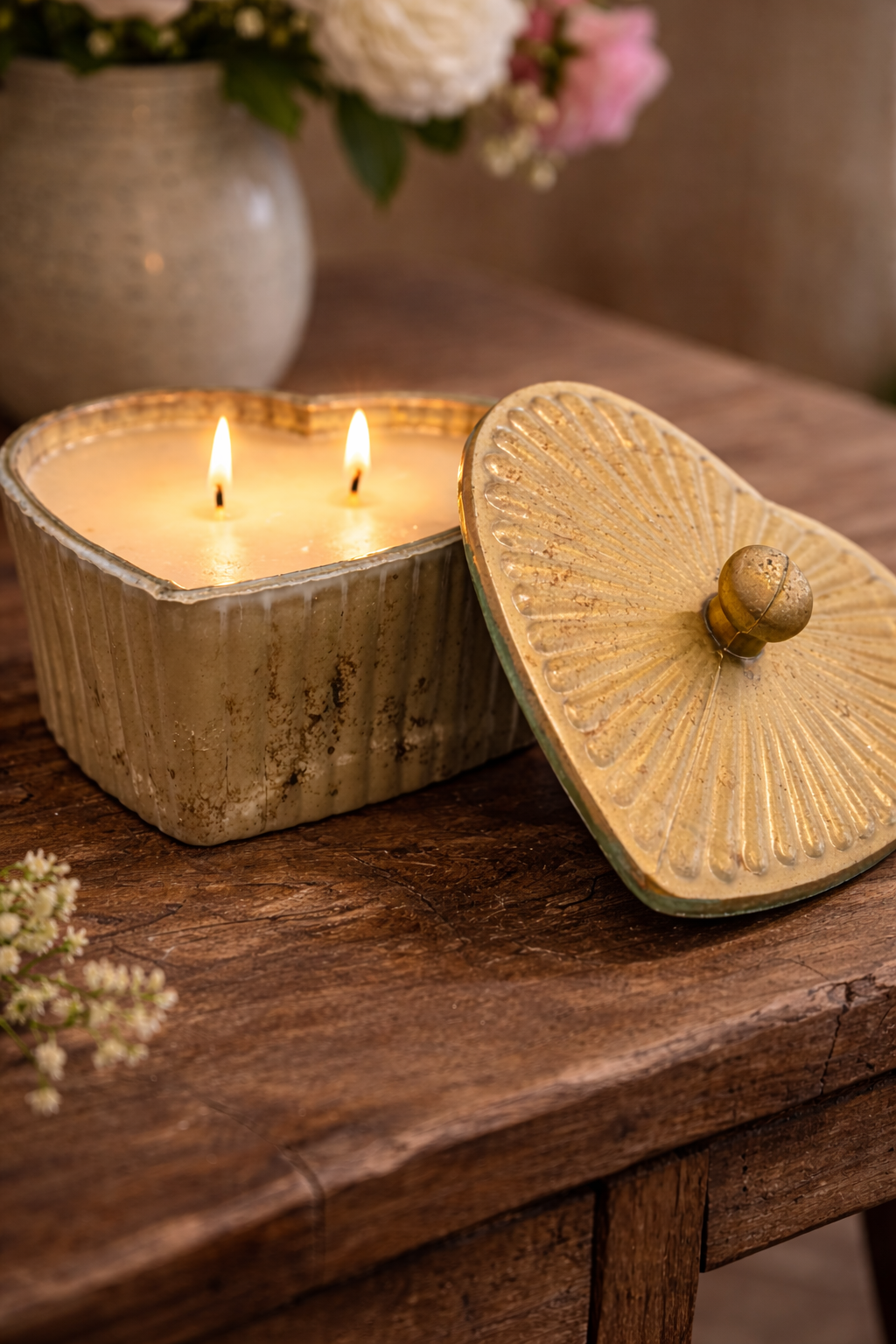 Add timeless charm and warm ambiance to your home with our Mercury Heart Soy Candle. Hand poured with care in Adel, Georgia, each candle features a beautifully textured mercury-style heart vessel paired with a rustic wooden lid for an elevated, vintage-inspired look.
