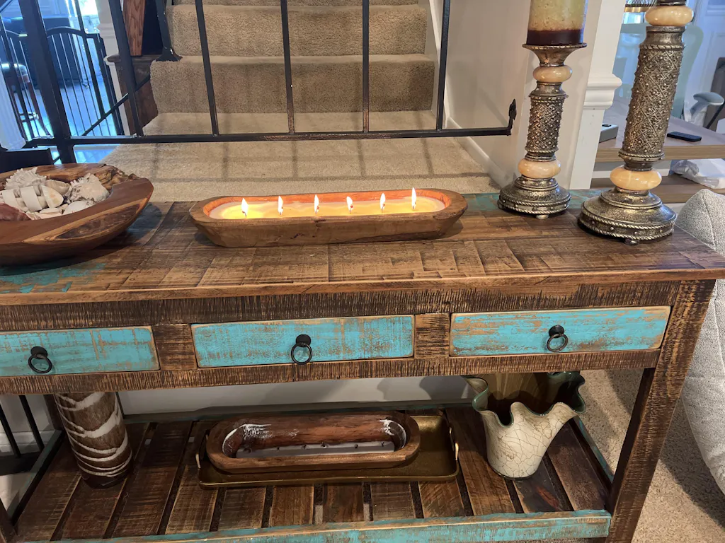 - Each wooden dough bowl is hand-carved, so no two bowls are the same! Each bowl is unique, and measures similar/around (20 x 6 x 2 1/2), and the exterior has been treated with a fire retardant. (Each is hand carved and painted, so dimensions WILL vary!) Each candle does hold the same amount of wax - 1.5 IBS!